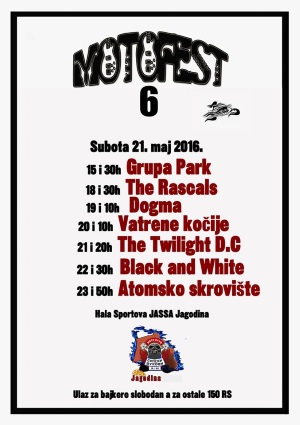 2016. Motofest 6 će se održati ove godine u Jagodini u subotu 21.maja 2016. godine. U okviru memorijala "Potpukovnik Goran Ostojić" i ove godine imaćete priliku da na dobrom razglasu slušate. kvalitene bendove. Zbog izuzetno nestabilnog vremena i velikog rizika od padavina Motofest 6 će se održati u Hali sportova JASSA Jagodina. Dakle, sam koncert će morati da bude održan u zatvorenom prostoru kako bi uopšte bio održan. Što se tiče parkinga, dovoljno je veliki za sve motore. Obavestićemo Vas i o dodatnim bajkerskim aktivnostima. Ulaz za sve bajkere je slobodan a za ostale je simboličnih 150 RS. Svirka počinje u 15 i 30h, pa se nastavlja u 18 i 30. Sviraju: Grupa
