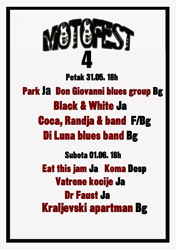 i salju je na e-mail MOTOFESTA Grupe nastupaju sa 4 kompozicije od kojih jedna mora da bude vezana za moto- kulturu, jedna mora da bude autorska a dve po izboru.